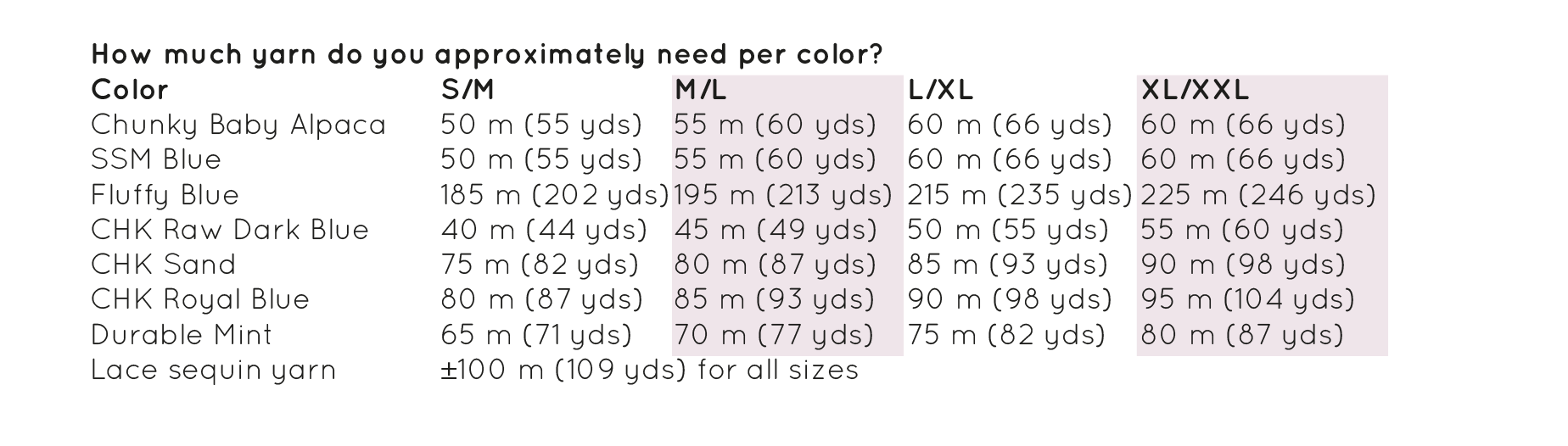 How much yarn do you need in total? (based on the colors in the picture for size S/M, M/L (L/XL & XL/XXL)